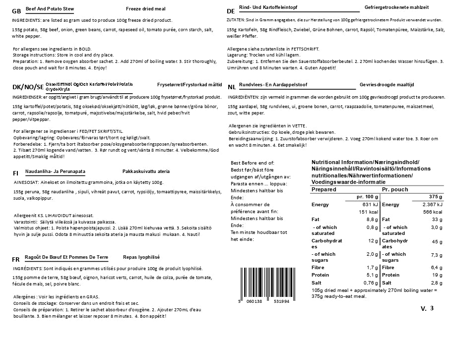 Take a real taste of home style cooking along with you on your journey by packing some of our delicious Beef and Potato Stew meals. Our meals stand out from the crowd because ours are cooked first before being freeze dried, which makes them taste even better than others might once they have been rehydrated. This means that we can consistently provide you with high quality, convenient meals without compromising on any of the nutritional value and great flavour that you would come to expect from a tasty home cooked meal.